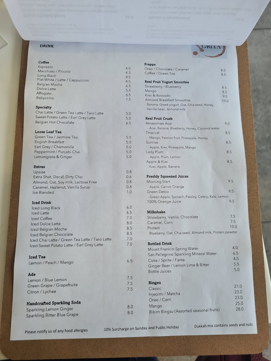 The menu at Cafe Grita offers a range of options suitable for breakfast, coffee breaks, and light meals throughout the day. It is structured into several key groups including coffee beverages, freshly squeezed juices, and an all-day food menu featuring a variety of breakfast and brunch dishes.